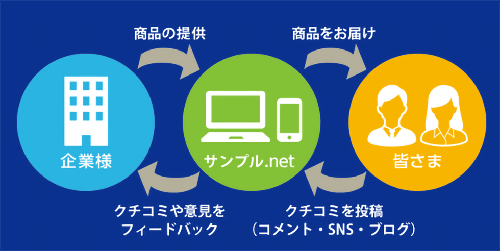 『サンプル.net』は商品を通して生活者である皆さまと、企業の商品開発者を結びつけることを支援するサイトでもあります。皆さまから集まる声(クチコミ)が商品開発者にとって新商品開発のネタや鍵となり、最終的には会員の皆さまの声で新商品が誕生する……そんな未来をめざしています。