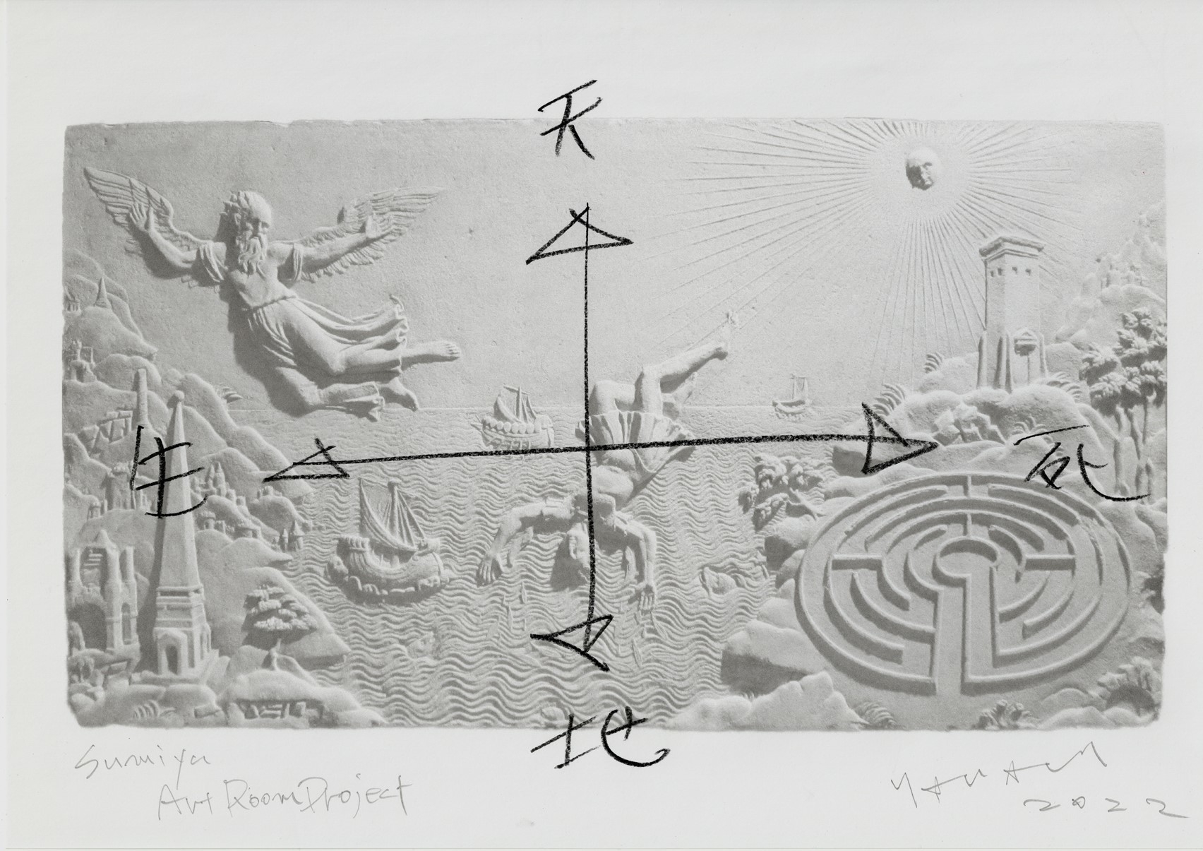 天を表象する客間は空(くう)をイメージする透明でミニマルな水の立方体の浴槽によるプリズムからの虹が視覚的な天を表現している。洋間の菊の作品の壁とイカロスの回廊の壁は和紙職人・ハタノワタル氏にお願いした。