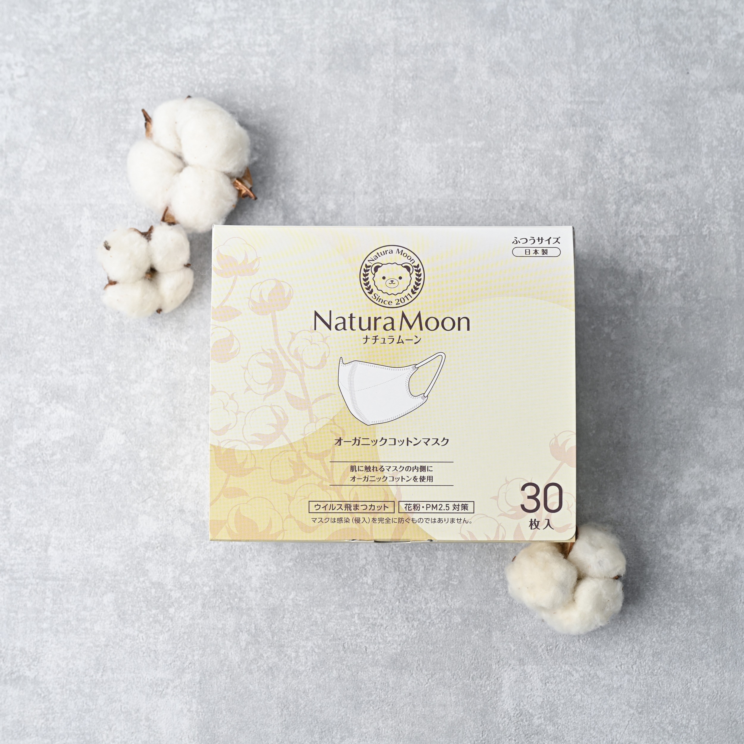 ナチュラムーンのマスクは、JIS規格(JIS T9001)に適合しています。医療機関でも使用されるサージカルマスクと同水準のフィルターを採用しており、ウイルスを含む飛沫や花粉をしっかりブロックします。
