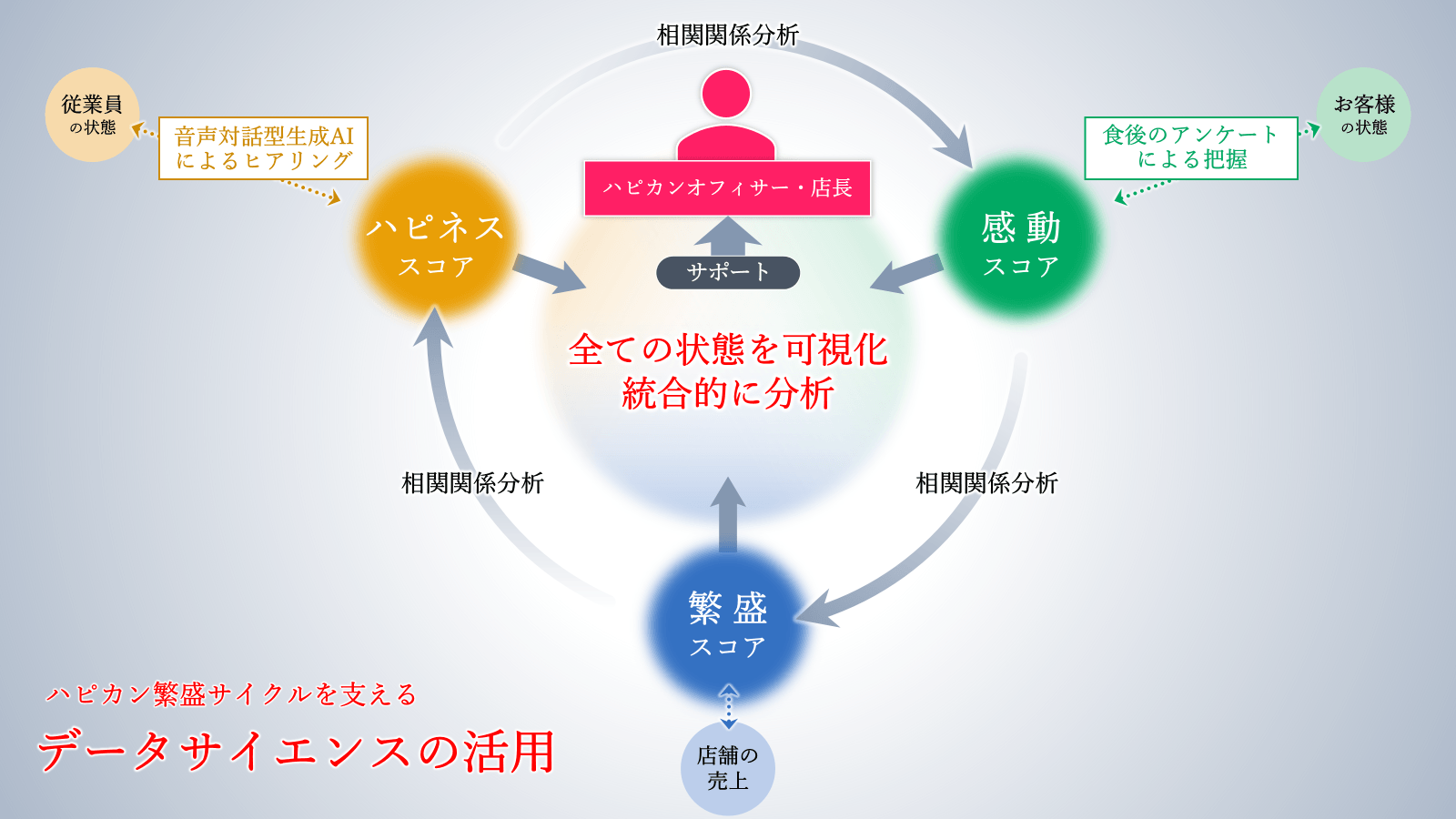 このたび開発した分析メソッドは、トリドールHDと丸亀製麺が大切にする理念と現場での知見に基づいた仮説と、サイカが培ってきたアカデミックな知見および分析ナレッジを融合させた独自のものです。複数の統計手法を組み合わせることで、これまで定量化が困難とされてきた「従業員の幸せ(ハピネス)」「お客様の感動」「事業成果(繁盛)」という要素間の関係性を構造モデル化して解明します。なお、この三つの要素の関係性をデータサイエンスで解明する取り組みは、外食業界において国内初となります。