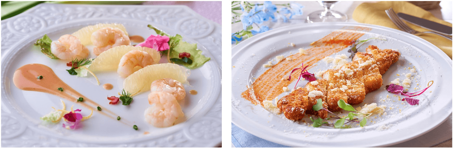 左:「小海老とグレープフルーツの盛り合わせ」。グレープフルーツのさっぱりとした酸味が食事のスターターにぴったり。オーロラソースが小海老とグレープフルーツのまとめ役です。