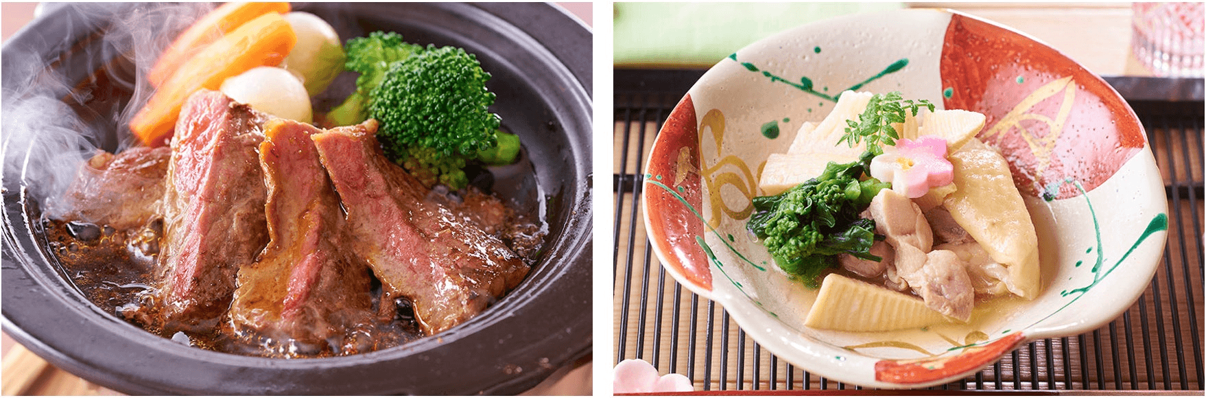 テーブル上の陶板で焼き上げるサーロインステーキの他にも、職人が目の前で握りたてをご提供する握り寿司など、ご馳走メニューが目白押し。他にも春の食材を使った一品、軽やかな食感の創作メニュー、「いちご」を使ったスイーツなど、目でも舌でも、春を満喫する美味しさでおもてなしします。