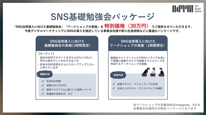 投稿企画の考え方からクリエイティブの作り方に関するTIPS、各SNSのアルゴリズムに加え、過去の炎上事例やインフルエンサー活用の際の注意点など、すでにSNSを活用している企業様向けの内容も含まれております。新入社員研修などにも最適なパッケージとなっておりますので、是非ご活用をご検討下さい。
