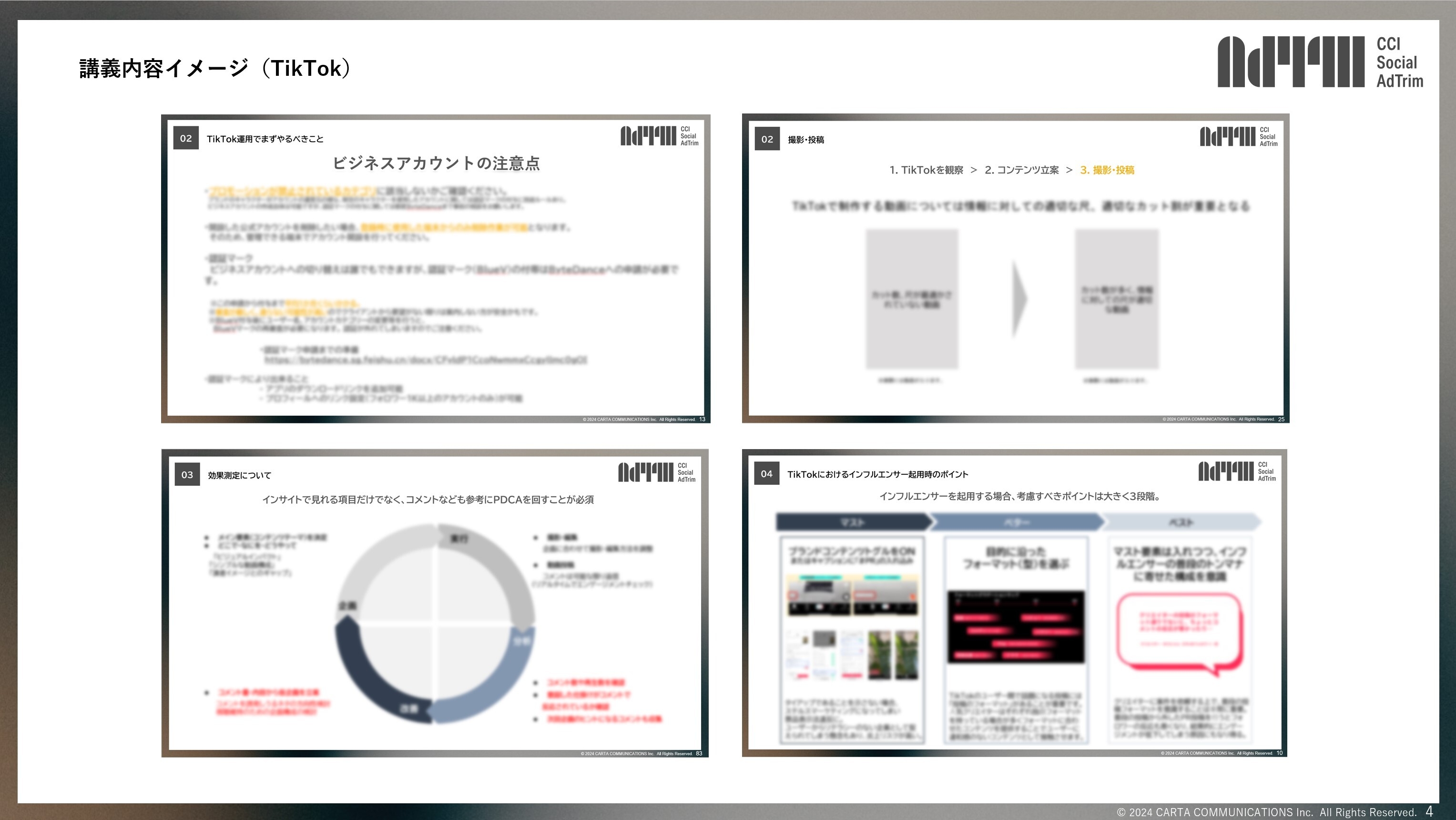 コンテンツの作り方から動画制作のTIPS、TikTokのビジネスアカウント運用における注意点、PDCAの回し方やインフルエンサー活用など、すでにTikTokを活用している企業様向けの内容も含まれております。