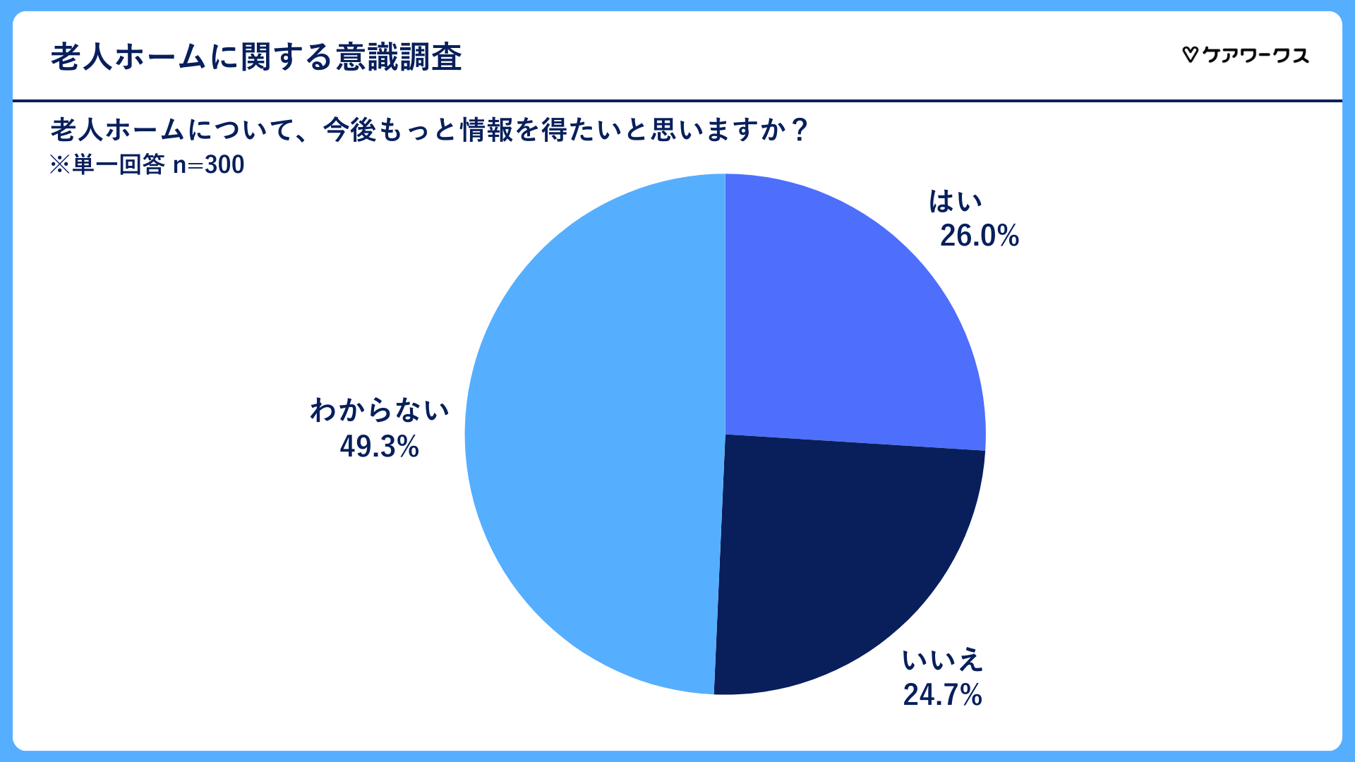 老人ホームについて今後もっと情報を得たいと思いますか?という問いに対しては、「わからない」が49.3%で最も多く、約半数が情報取得への明確な意向を持っていないことがうかがえます。
