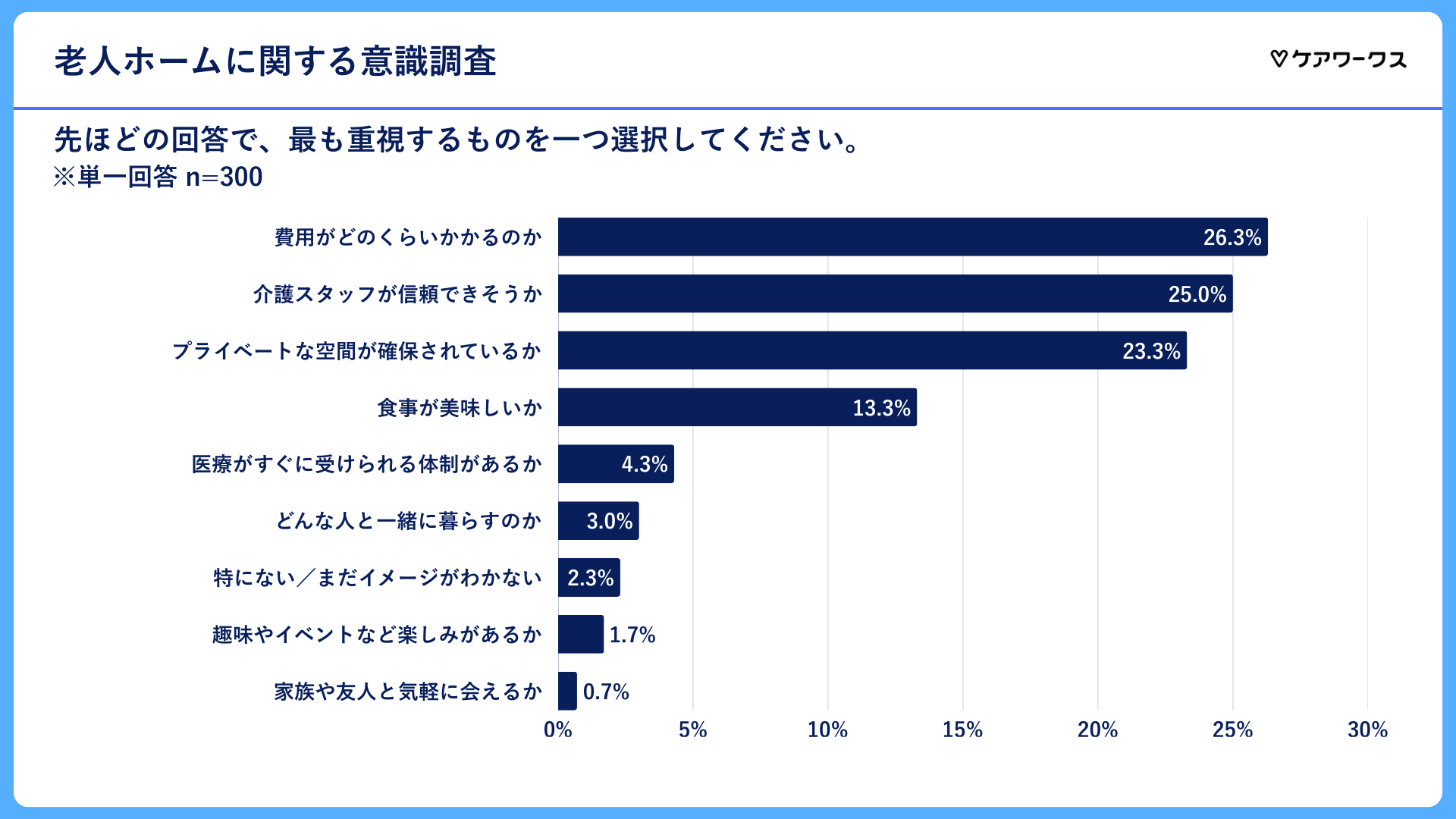 30~50代の男女300人対象「老人ホームに関する意識調査」を実施 気になる点は「コスト・信頼性・プライベートの確保」