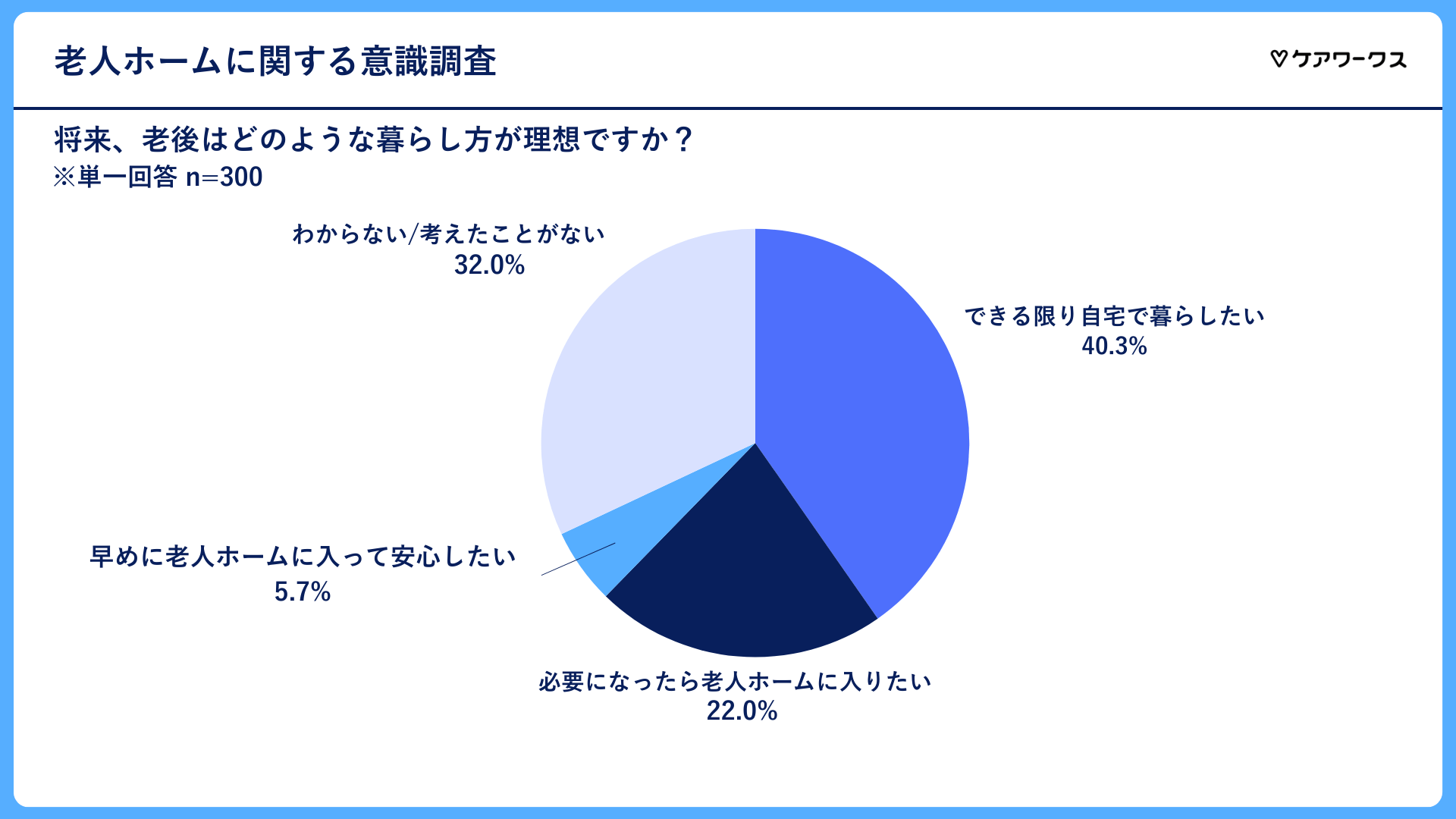 本調査を通じて、30代から50代の方の老人ホームに対するイメージが「費用が高い」「スタッフが大変そう」「周囲とうまくやっていけるかの不安」「自由度が低そう」といった比較的ネガティブなものであることがわかりました。また、老後に関する漠然とした不安を抱えている方が多いことも判明しました。