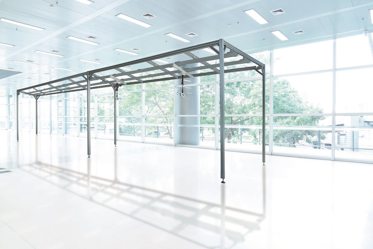 「天井へ直付けしたレールにリフトを付けるタイプ」、「歩行器タイプ」、リハビリ用のルームランナーと組み合わせてその場で歩行練習が出来る「据え置きタイプ」など大きく分けて3種類の機器と3種類のハーネスを展開しています。天井直付けレールのための下地工事が出来ない場合でも門型のフレームをつなぎ合わせた下にレールを付けるなど、既存の病院リハビリ室への導入も可能です。