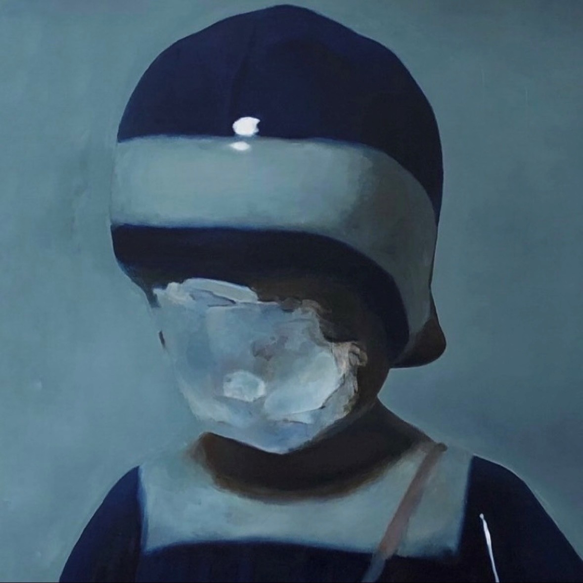 私たちはつい、目に見えるものをそのまま信じてしまいがちです。この展覧会「EYES」において、私はあえて、「目が捉えているものは本当に真実なのか?」という問いを立ててみたいと考えました。以前より描いている「zero gravity」シリーズの背景を排除し浮遊感を保った構図は視点を固定しにくく、その為鑑賞する際縦位置でも横位置でも選ぶことができる、つまりどの視点をとるかという主題を内包しています。今回はそこにアナモルフォーシス(歪像)の技法を加えることで、「見る」という行為そのものに焦点を当てました。この技法の見る角度によって像が歪み、ある一点からのみ明瞭に姿を現す構造は、視覚の不確かさを強調します。美術史上アナモルフォーシスといえばホルバインの「大使たち」が有名です。あの絵に描かれた髑髏は正面からは何も見えず、斜めから見ると初めて像が立ち上がるという視覚トリックの鮮烈な象徴であり、観るという行為に対する根本的な疑念を喚起します。強いメッセージ性を感じさせるインパクトのある仕掛けですが、この作品は控えめに像を歪ませることで主張しすぎず、視点の揺らぎとしてアナモルフォーシスを取り入れました。正面からは曖昧に揺らぐ像があり、極端な歪みではない分鑑賞者の中に不穏さや違和感が広がるかもしれません。