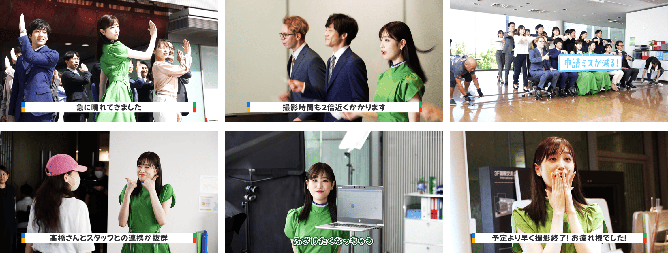 今回のCMで髙橋さんが演じるのは「勤怠管理の化身」と「経費精算の化身」。二人の髙橋さんによるシンクロダンスで「クロノス経費精算」が社内にもたらすポジティブな変化を表現。社内の大勢の人々を巻き込みながら歌い踊る、まるでミュージカル映画のような展開のCMとなっています。ラッキィ池田さん考案のクセになる振り付けにもご注目ください!