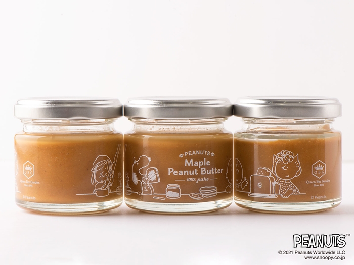 スヌーピーや仲間たちと、ナチュラルで上質なおいしさを通しておうち時間を愉しんでほしい。そんな想いから生まれたのが、クインビーガーデンの『Pure Honey PEANUTS/Pure Maple PEANUTS』シリーズです。