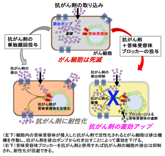 がん細胞内部には多種多様な抗がん剤でも感受しうる苦味受容体が常に待ち構えます。抗がん剤が細胞内に入り込むとこれにより受容体は活性化され、“排出ポンプ”を作動し、薬剤の細胞内蓄積を抑えていたのです。