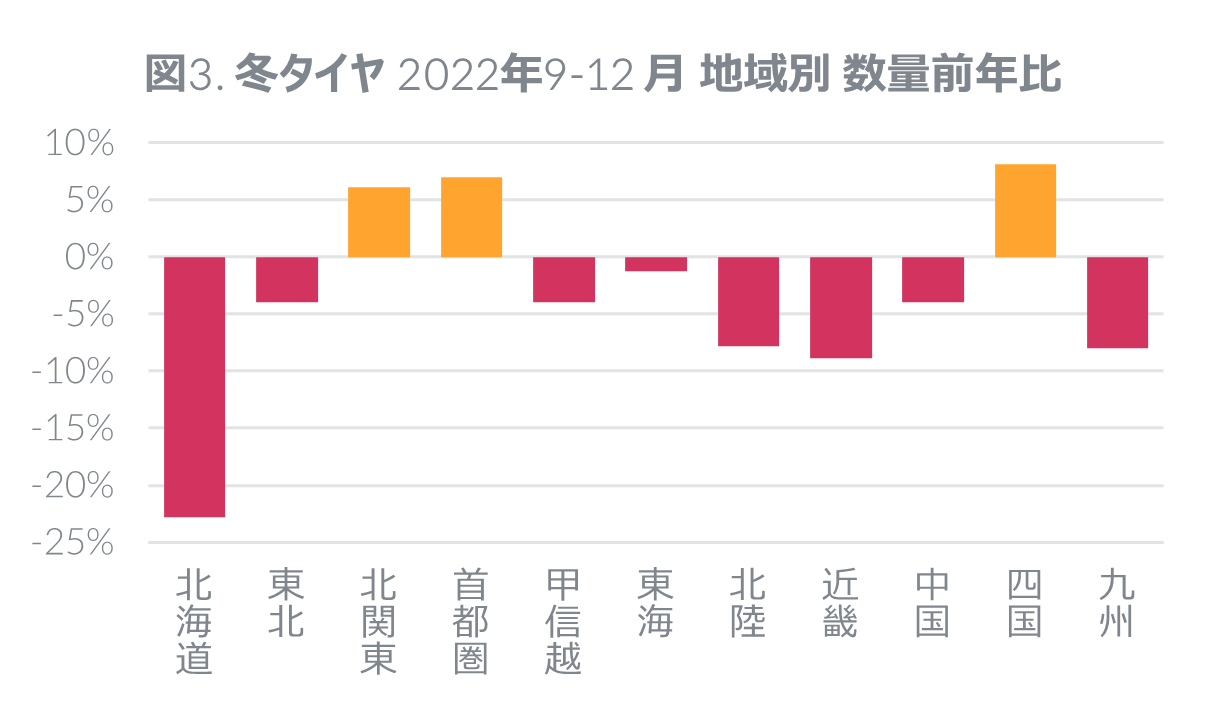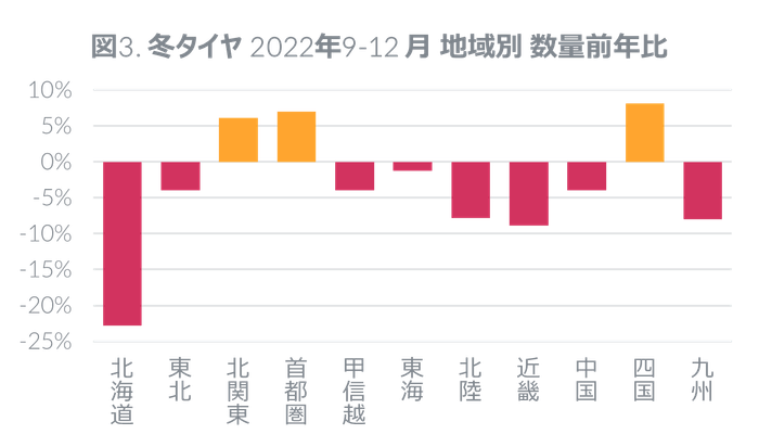 2022年9-12月の冬タイヤ販売は数量前年比3.8%増であったが、店頭販売では同4.3%減と前年を下回った。降雪地域の販売状況をみると、北海道では数量前年比22.8%減と大きく落ち込み、東北では同4.0%減、北陸では7.8%減であった(図3)。