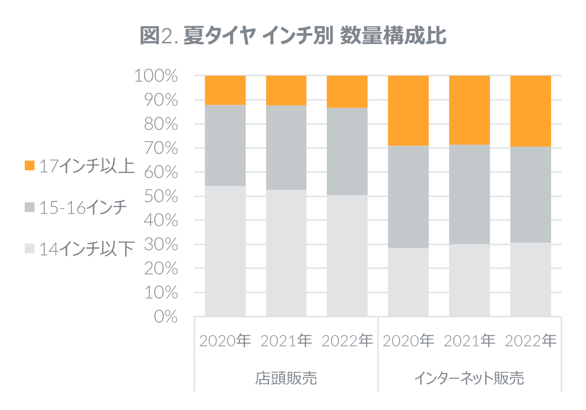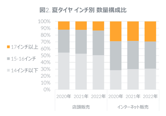夏タイヤでは大きいサイズへの需要が徐々に高まっており、これも価格上昇の一因と考えることができる。17インチ以上の数量構成比をみると、店頭販売では前年の12.4%から13.3%に、インターネット販売では28.7%から29.4%に拡大した(図2)。金額構成比では、店頭販売では30.2%、インターネット販売では52.9%に至った。なお17インチ以上での販売上位3サイズは、店頭販売では215/55/17、215/45/17、225/45/18、インターネット販売では225/45/18、215/55/17、215/45/17であった。