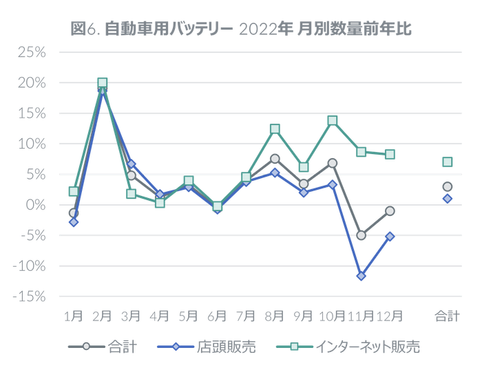 2022年の国内自動車用バッテリー市場は数量前年比3.0%増と微増であった(図6)。月別にみると、前年より気温が低かった2月は販売が急増し、店頭販売では数量前年比18.6%増、インターネット販売では同20.0%増に達した。ただ、店頭販売では需要の最盛期である11月、12月に前年を下回ったことで、通年では数量前年比1.0%増にとどまった。