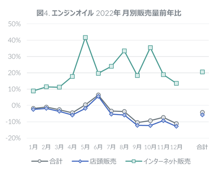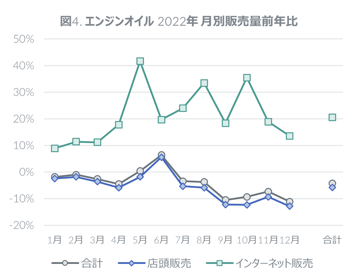 2022年の国内エンジンオイル市場は販売量前年比4.2%減と微減であった。店頭販売では6月を除く各月で前年を下回り、通年で同5.8%減であったことに対し、インターネット販売ではすべての月でプラス成長を見せ、結果、通年で同20.6%増と二桁成長を遂げた(図4)。