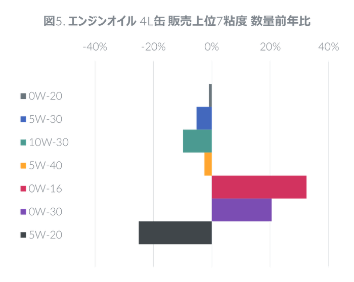 4L缶では0W-20の販売が最も多く数量ベースで41.9%を占めたが、前年からは1.0%減と販売を落とす結果となった。他方、0W-16は数量前年比32.4%増、0W-30は同20.5%増と大幅な伸長を見せた(図5)。