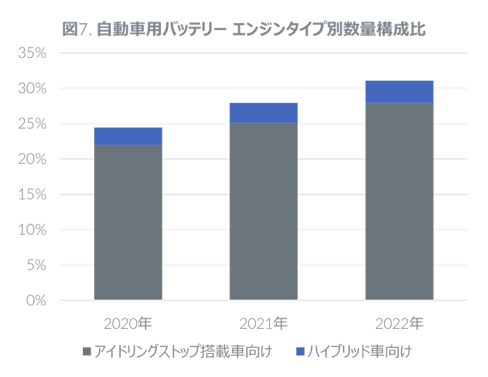 エンジンタイプ別では、ハイブリッド車向けとアイドリングストップ搭載車向けのバッテリーが好調で、数量前年比はそれぞれ16.6%増、14.5%増と二桁成長を遂げた。数量構成比ではハイブリッド車向けが3.2%、アイドリングストップ搭載車向けが27.9%と、合計で31.1%に至った(図7)。