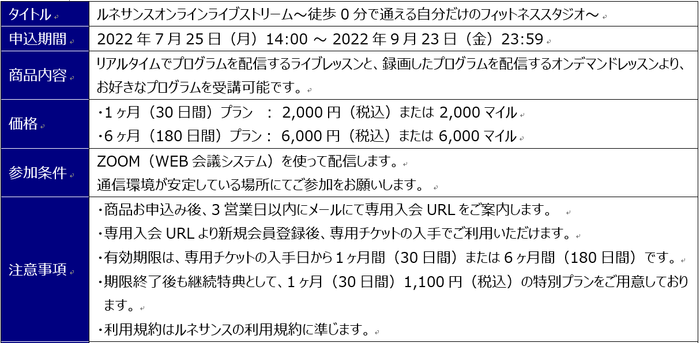 この度、ANA Xが目指す「毎日の暮らしをより健やかに、活動的にするお手伝いする」という方向性と、ルネサンスが提供する時間や場所を気にせず運動習慣を身につけることができるオンラインフィットネスサービス「オンラインライブストリーム」が一致したことから、日常生活をより豊かにするための健康維持・増進のサポートを目的として、本商品を企画しました。