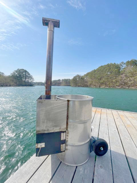 薪ストーブを背負った新機構の究極のドラム缶風呂No-Blow(野風呂)。