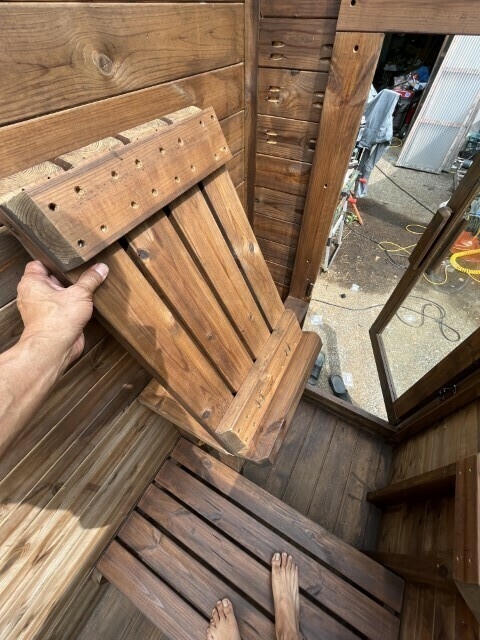 サウナ小屋は基本的にはサウナストーブを横目にしながらベンチに座ります。サウナAddictの私は、真摯にサウナストーブと向き合いたい思いから、ベンチ部を可倒式とすることでこの問題を解決しました。電気サウナストーブに向き合い、ローリュを行いながら、サウナ熱を愛でてください。開発中の仕様です。