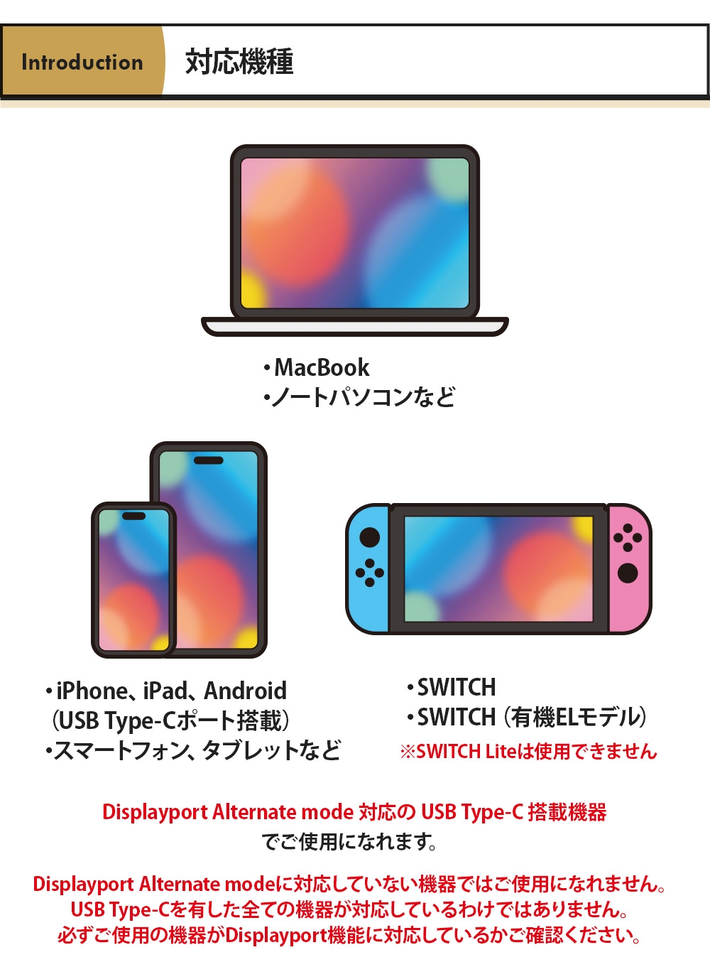 ※対応デバイスはUSB-Cポート搭載でDisplay Port Alternate Mode(ディスプレイポート オルタネートモード)対応機種に限ります。