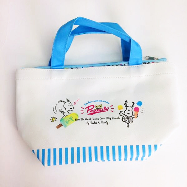 濃いめのブルーのランチバッグです。アイスを持ってゴキゲンなスヌーピーたち♪PEANUTSのロゴもポップです。内側のポーチもストライプ地になっているのが分かりますね。