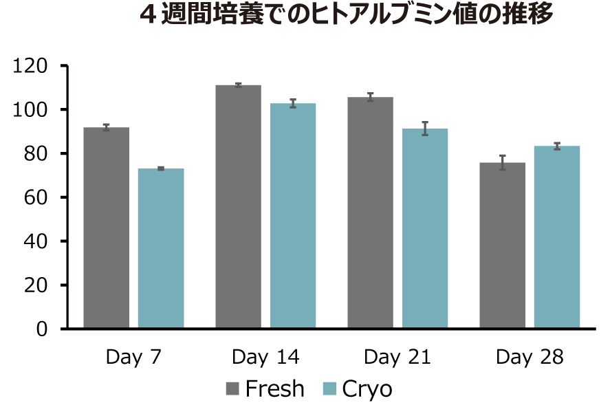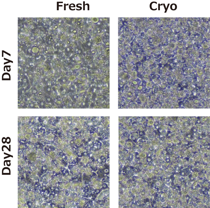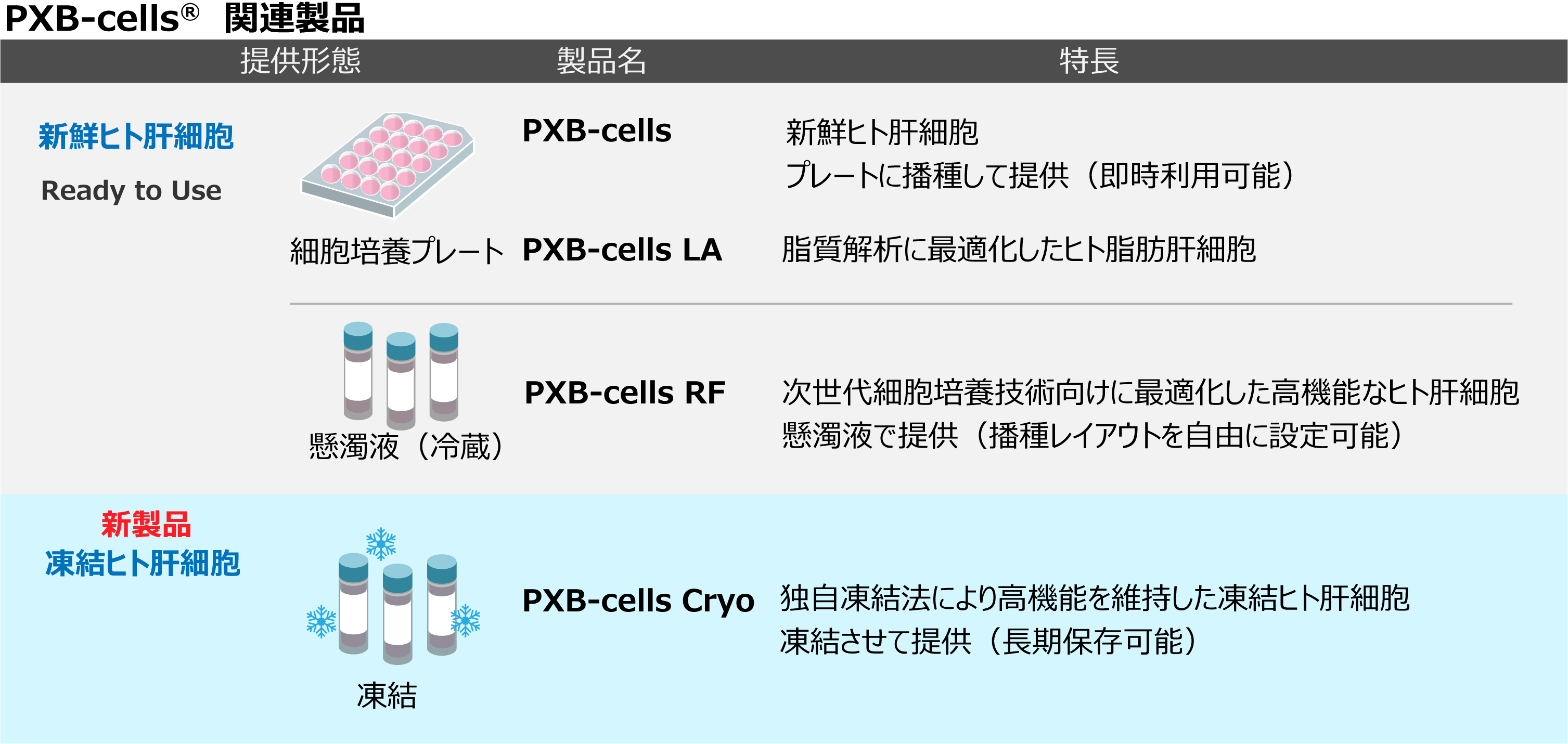 上記の機能面の他、凍結することで長期保存が可能となり、一定数をまとめてご購入いただくことで海外輸送時のコスト軽減が図れること、また、ストックされた凍結ヒト肝細胞を研究者の方のご都合にあわせて試験に使用できるため、従来の新鮮PXB-cellsとあわせて創薬研究者の方の多様な用途に対応できるものと考えています。