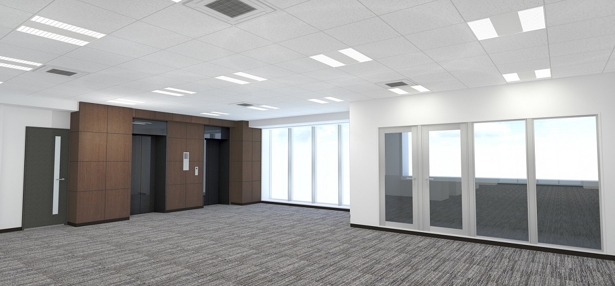 各階貸室は、天井高2,700~3,500mm、約64坪。レイアウトの変更が容易なグリッド式天井システムを採用することで、フレキシブルな活用を可能にしました。また、安心してビジネスに集中頂けるよう、トリプルセキュリティを採用するほか、耐震構造、停電にも対応したビジネス環境を実現。窓にはLow-Eガラスを採用し、日射による空調負荷を軽減することで、環境にも配慮した設計となっています。