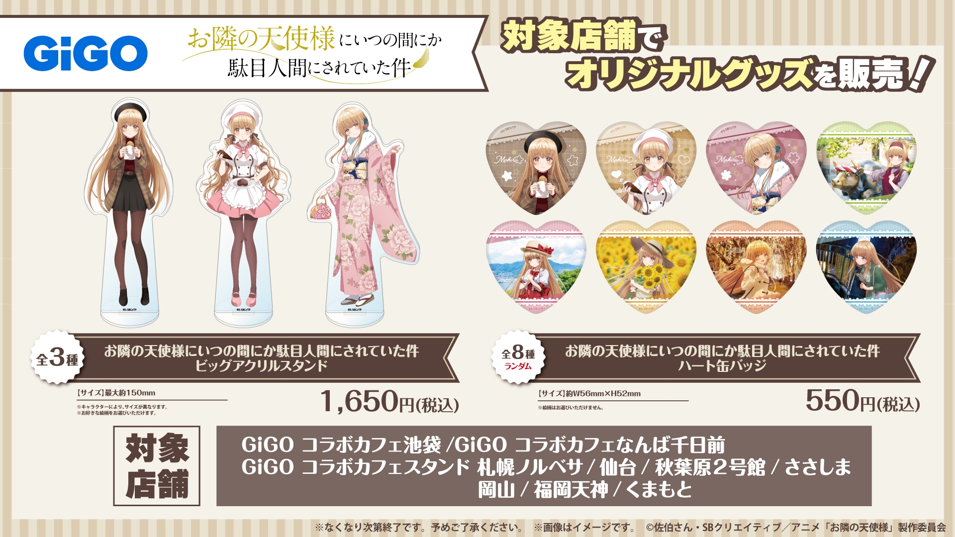 販売店舗:GiGO コラボカフェスタンド札幌ノルベサ、GiGO コラボカフェスタンド仙台、GiGOコラボカフェ池袋、GiGO 秋葉原2 号館、GiGO コラボカフェスタンドマーケットスクエアささしま、GiGOコラボカフェなんば千日前、GiGO コラボカフェスタンド岡山、GiGO コラボカフェスタンド福岡天神、GiGO コラボカフェスタンドくまもと