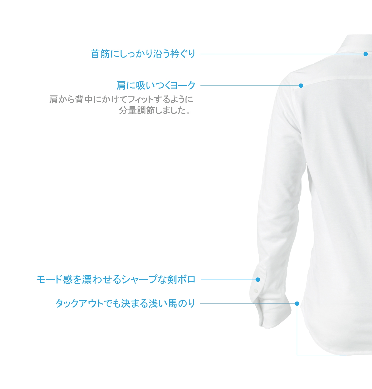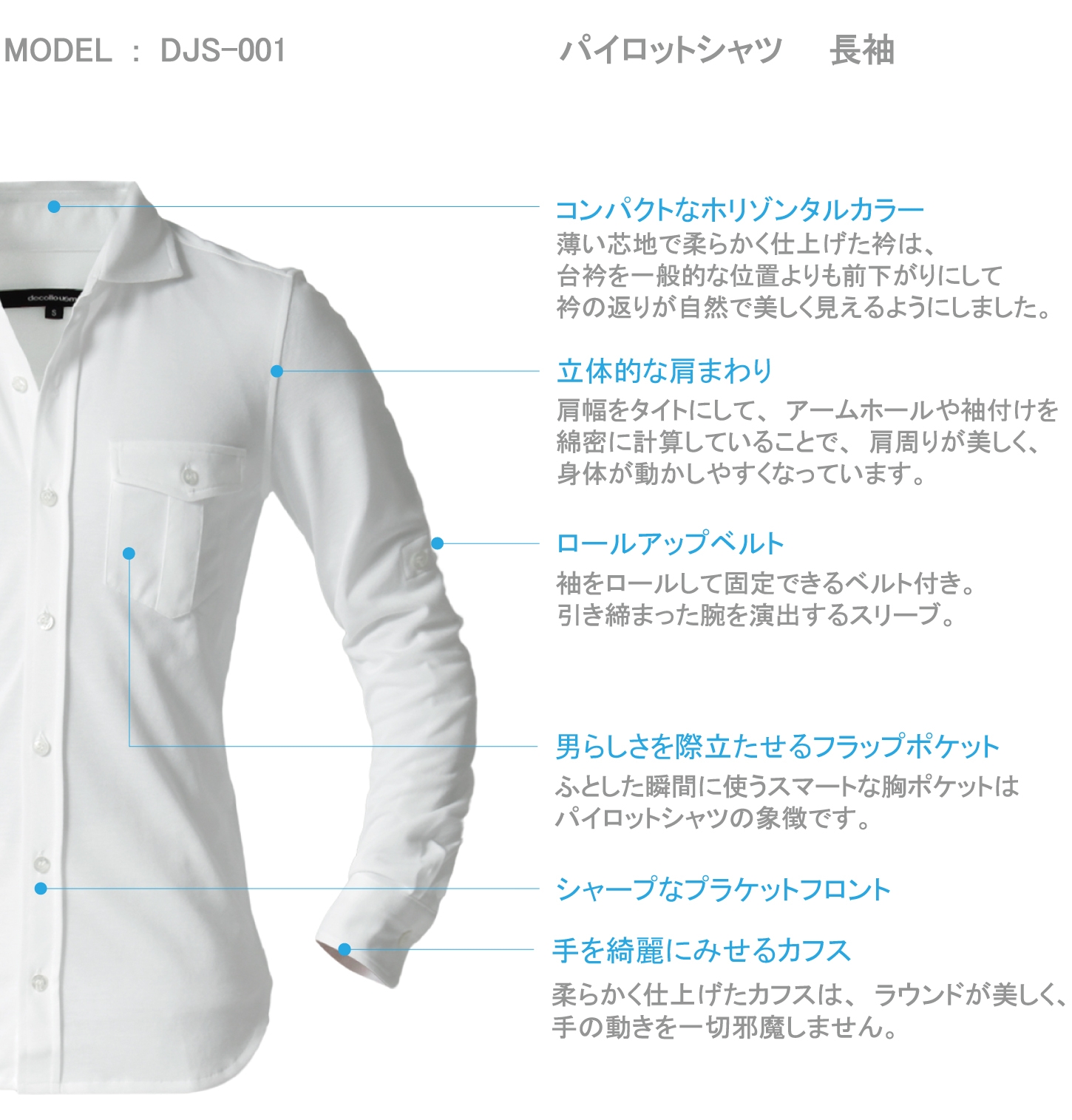 着る人のパフォーマンスを引き上げる機能性と、シャツの取扱いを簡単にした便利な機能性。そして、まるでメンズシャツ専門工房でオーダーメイドしたかのようなフィット感と着心地。ビジネスシャツとしても、カジュアルシャツとしても対応出来るバランスの良い高級感。個性を内に秘めたベーシックなデザインは、全ての人達のライフスタイルに溶け込み、様々なシーンに合わせてコーディネートできる柔軟なパイロットシャツです。