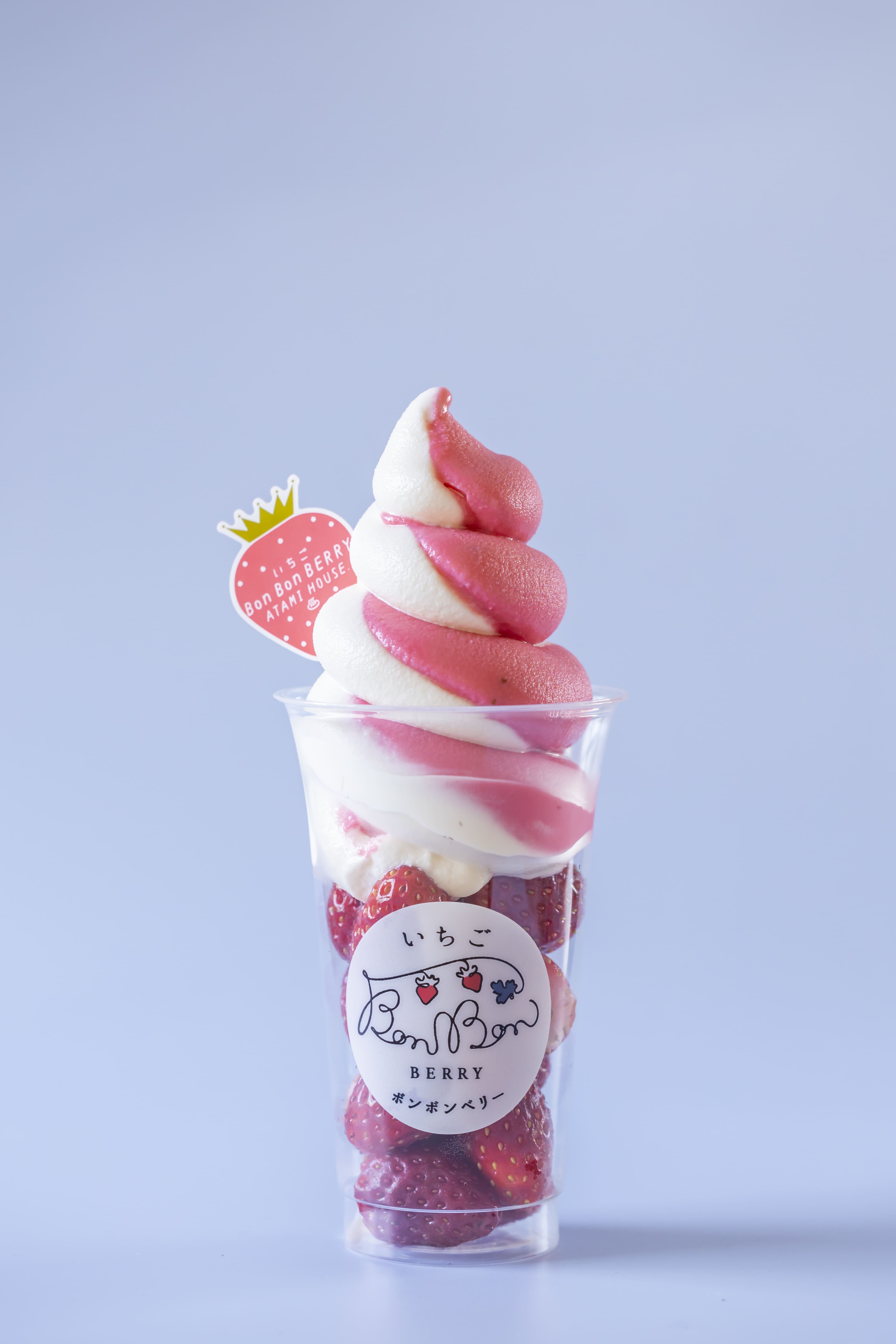 いちご、ふわふわスポンジ、ホイップクリームをカップに詰めて、地元・丹那牛乳のミルクソフトをのせた、見た目も味わいもまるでショートケーキのようなソフトクリームです。