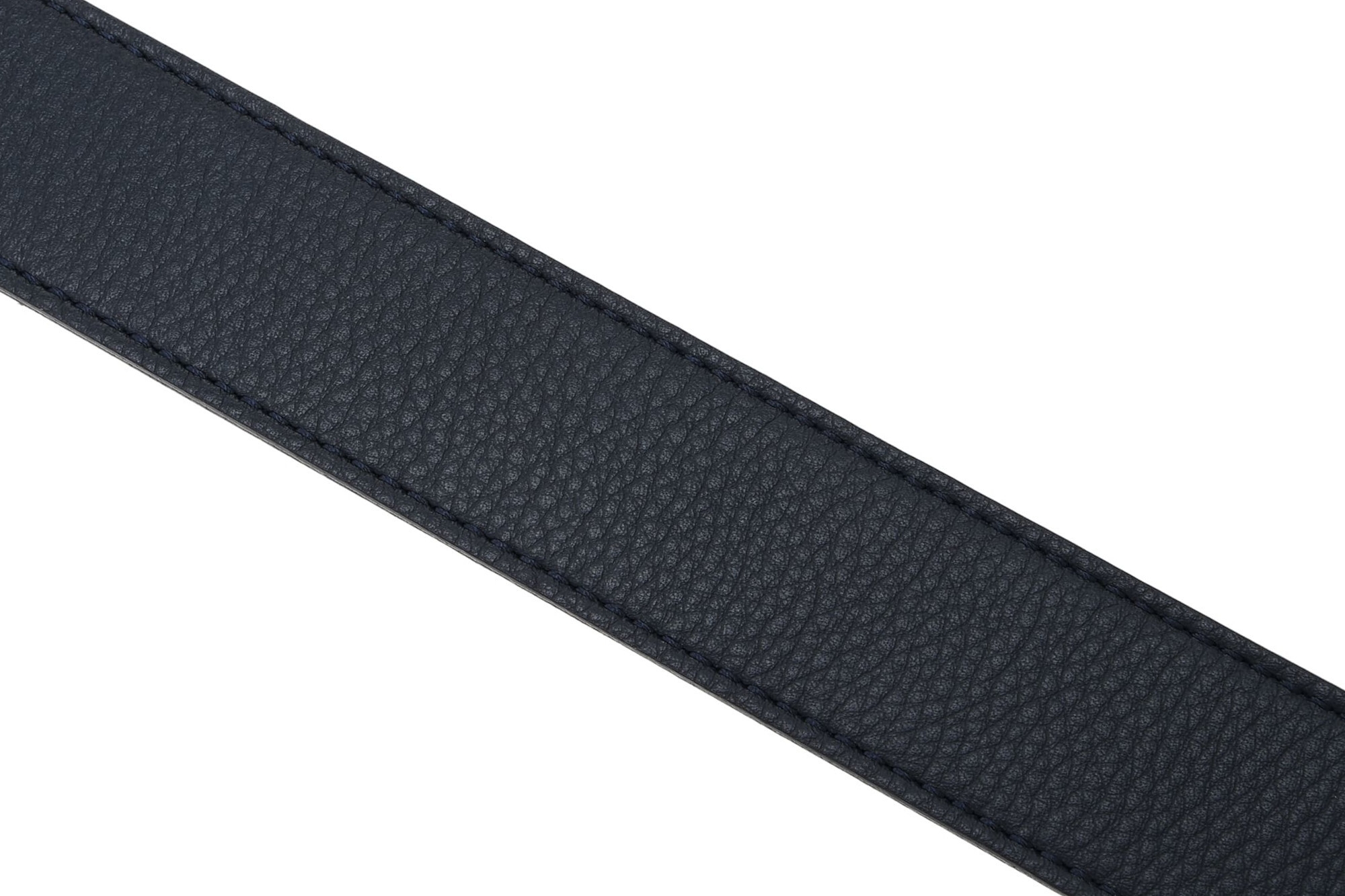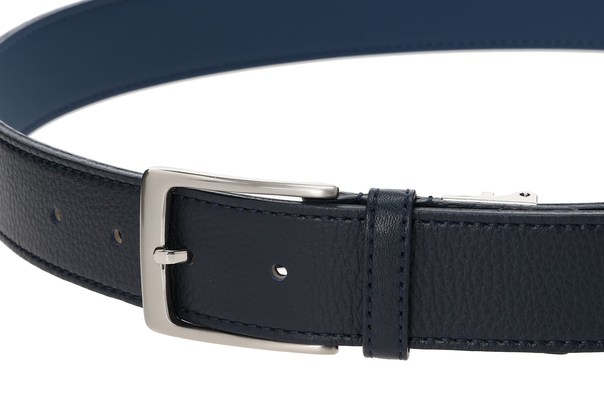 バックルは浅草製の真鍮素材。真鍮は丈夫でずっしりと重く高級感があります。表面をニッケルメッキ処理した後に方向性のある細かな傷を付けるサテーナ加工をすることで実現した、光沢を抑えた落ち着いた輝きが特徴です。サテーナ加工は高級感を高める表面処理で、貴金属などにも良く使われます。特に、ドレス系やフォーマル系に最適な加工です。