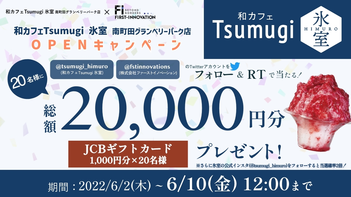 和カフェTsumugi 氷室 南町田グランベリーパーク店のTwitter(@tsumugi_himuro)とファーストイノベーションのTwitter(@fstinnovations)をフォローし、対象の投稿をリツイートしてください。