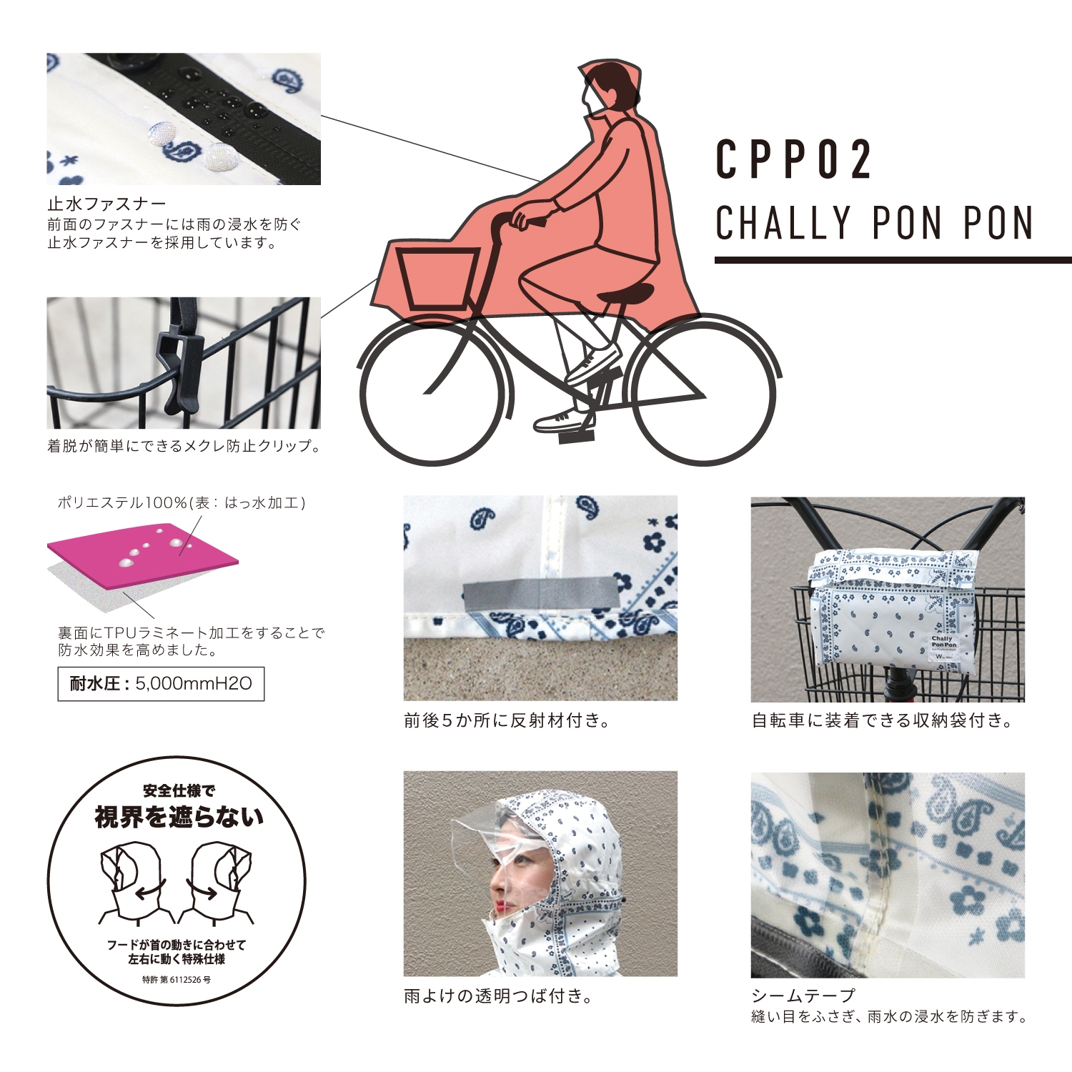 クロスバイク・ロードバイクにも対応した「レインバイシクルポンチョ」、荷物が濡れないようレインポンチョを自転車のカゴにかぶせて使う「チャリーポンポン」、自転車用としてはもちろんレインポンチョとしても使える「レインバイシクルスリーブポンチョ」(新作)の3種類の展開です。