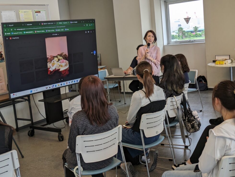 神戸市東灘区がなぜ「スイーツの町」なのか、「神戸ひがしなだスイーツめぐり」はなぜ始まったのか等、東灘区役所地域協働課職員による講義で知識を身に付けました。また、会場となる神戸マルイ社員より施設特性や開発のアプローチ法などを学びました。