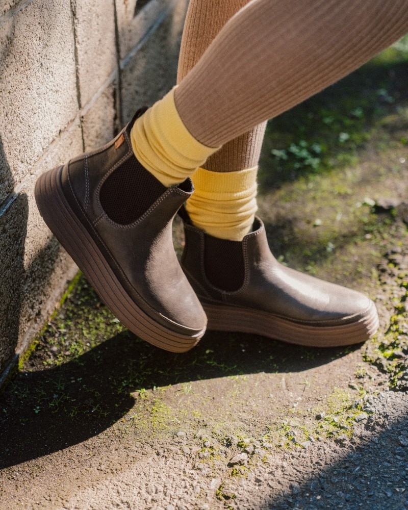 トレンド感のあるデザインに、MINNETONKAの個性を表現する素材のコントラストと、ステッチワークを施したハイブリッドモデル。日常使いしやすいクリーンなルックスと、厚底ソールのクッション性により、長時間のお出かけにも快適に対応します。
