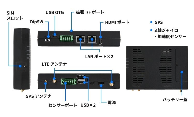 ・車載向け用途の特長として、車速パルスや温度計、通電センサーを活用可能で、多彩なセンサーポートに対応しています。また、UDR対応のGPSも搭載し、車載対応の振動試験にもクリアしていますので、安心してご活用いただけます。