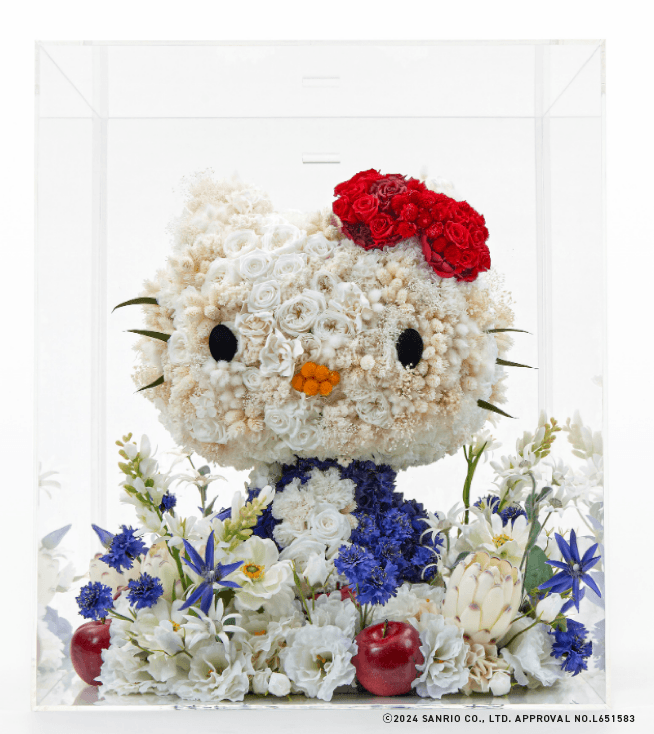 ハローキティの丸みを帯びた愛らしい全身フォルムや赤いリボンは、やわらかな花びらが特徴のバラやカーネーション、アジサイ、カスミソウなどの数種類の花々によって表現し、足元にはクレマチスやプロテアなど、大人の雰囲気と高級感を醸し出す花々を敷き詰めています。