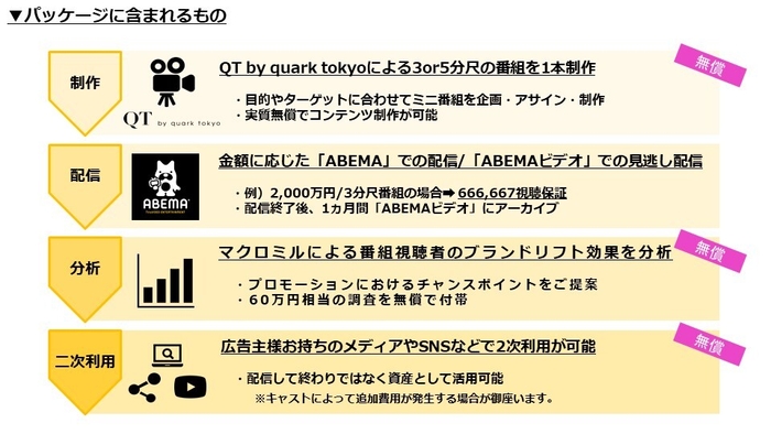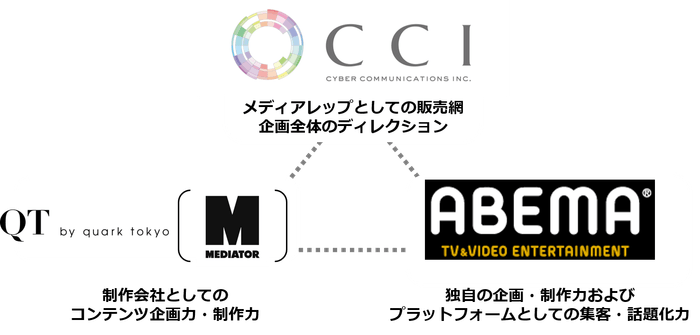 本プロダクトは、「QT by quark tokyo」にて制作した3分~5分尺のオリジナルミニ番組をテレビ&ビデオエンターテインメント「ABEMA(アベマ)」の編成番組枠とCM枠にて配信します。「QT by quark tokyo」の高い企画・制作力と、唯一無二の配信プラットフォーム「ABEMA」の独自の企画・制作力及び集客・話題化力、CCIの販売力を集結することで、企業は配信ターゲットとなる視聴者に対して、質の高いマーケティング効果が期待できます。