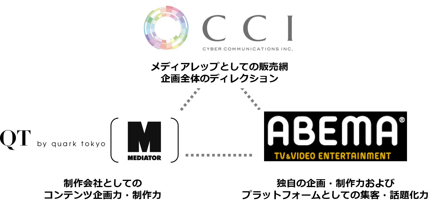 株式会社CARTA HOLDINGSのグループ会社である株式会社サイバー・コミュニケーションズ(本社:東京都中央区、代表取締役社長:新澤 明男、以下CCI)は、株式会社AbemaTV(本社:東京都渋谷区、代表取締役社長:藤田 晋、以下AbemaTV)、株式会社Quark tokyo(本社:東京都品川区、代表取締役社長:楽々朝光、以下Quark tokyo)、株式会社Mediator(本社:東京都渋谷区、代表取締役:オノダタカキ)と共に、動画コンテンツマーケティング支援をワンストップで提供する共同プロダクトの販売を開始します。