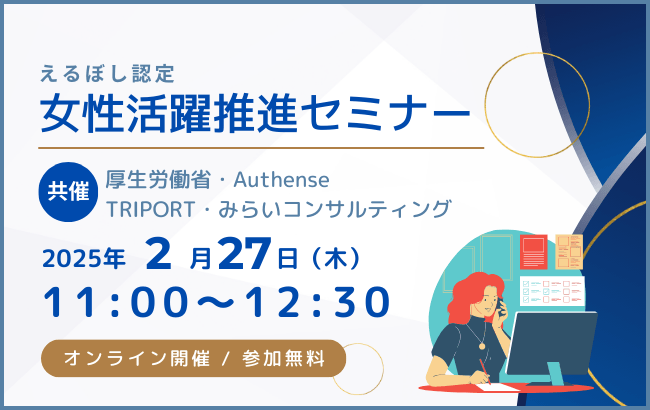 みらいコンサルティンググループ(本社:東京都中央区、代表:久保 光雄 岡⽥ 烈司)は、2025年2月27日にセミナー『えるぼし認定 女性活躍推進セミナー』をWEBにて開催します。