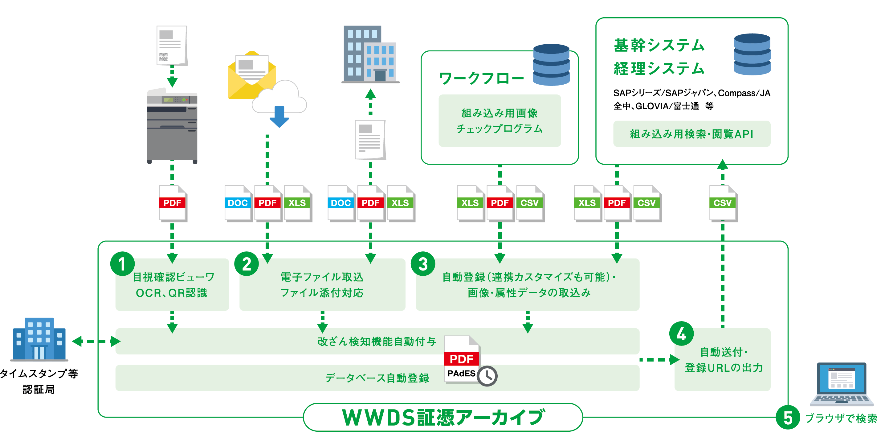 WWDS証憑アーカイブは、電帳法法的要件を満たしドキュメントライフサイクル管理を可能にした電帳法対応オールインワンパッケージです。