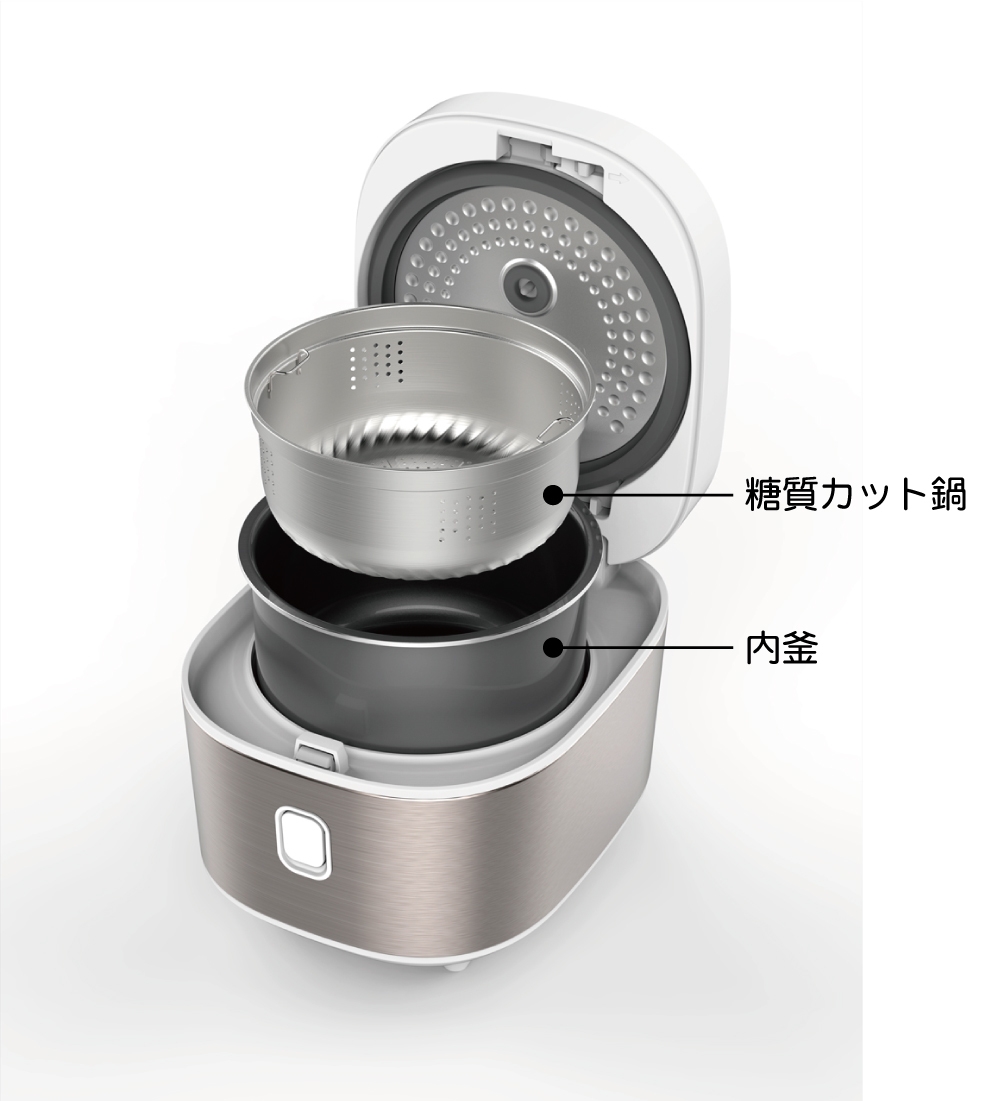 いつものご飯を糖質カット!付属の糖質カット鍋と内釜をセットし炊飯することで、お米を煮る時に出る糖質が含まれる煮汁を内釜に落としてして糖質を抑える仕組みで、約31%の糖質をカットできます。