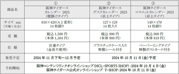 毎年、阪神タイガースファンの皆様にご好評いただいております「阪神タイガース カレンダー 2025年版の3種類((1)壁掛けタイプ・(2)卓上タイプ・(3)卓上タイプマスコット)」について、10月4日(金)から阪神コンテンツリンクオンラインショップ(HCL-SPORTS SHOP)( http://www.hcl-sportsshop.com/ )、10月11日(金)から阪神タイガース公式オンラインショップT-SHOP( https://shop.hanshintigers.jp/ )で順次受付を開始します。