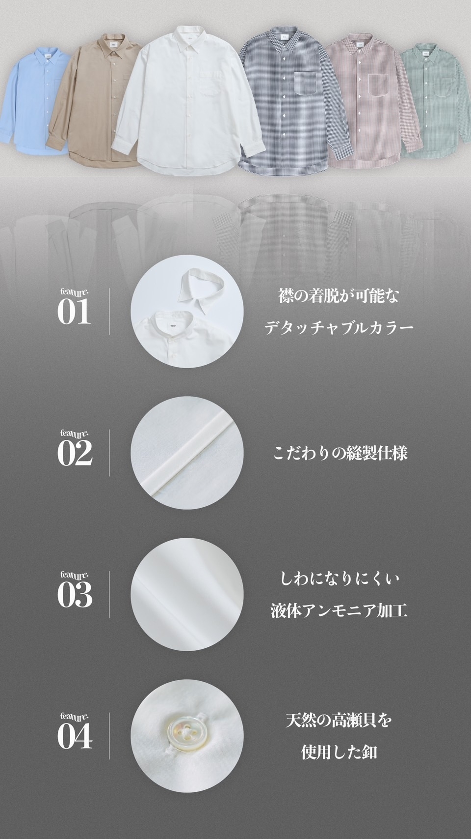 「レギュラーカラー」と「バンドカラー」の両方をこの1着でお楽しみ頂ける構造になっています。