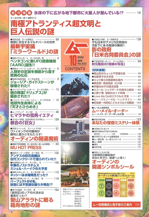 2色刷り特集 影の日本政府「日米合同委員会」の謎/ペンタゴンに新UFO調査機関「AARO」誕生‼/ジョージア・ガイドストーンが破壊された‼/実用スペシャル オーディンの開運魔術/特別とじ込み付録 オーディンの開運シンボルシール/聖山アララト山に眠る箱舟地形の謎/中東のノストラダムス ミシェル・ハーイクの大予言/ネッシーは水陸両生だった‼/樹の精霊ドリュアスが撮影された‼/ほか
