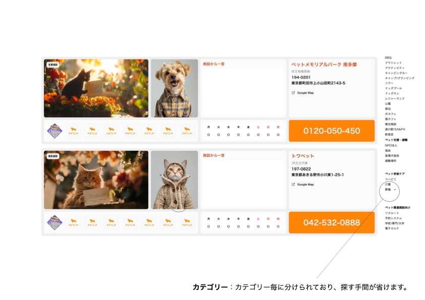 ペット葬儀の情報は、公開されていないケースが多く、信頼できる葬儀会社を迅速に見つけることが難しい状況にあります。このような課題を解決するために、「PETLIF」は葬儀対応が可能な施設を含む包括的な情報を公開し、信頼性の高い葬儀・供養施設を迅速に検索できるプラットフォームとして機能しています。