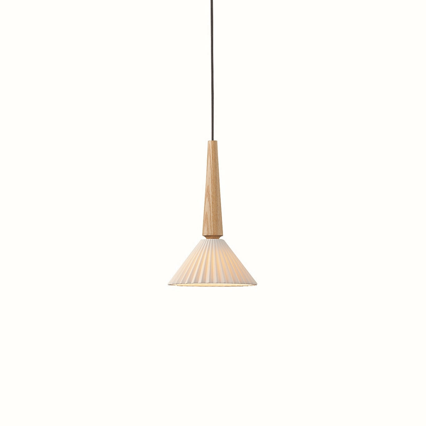無垢材から削り出した木飾りとプリーツデザインの磁器セードを組み合わせたペンダントライトを8種ラインアップいたしました。磁器特有の優しい陰影と点灯感により、あたたかく落ち着いた雰囲気を演出します。また消灯時は、プリーツのくっきりとした陰影が見え、上品で繊細な印象を空間に与えることが出来ます。色温度は、2色(2700K電球色/3500K温白色)、飾り部分のカラーを2色(タモ、タモ・黒色塗装)ご用意し、お好みのインテリアや目的・用途に合わせてお選びいただけます。