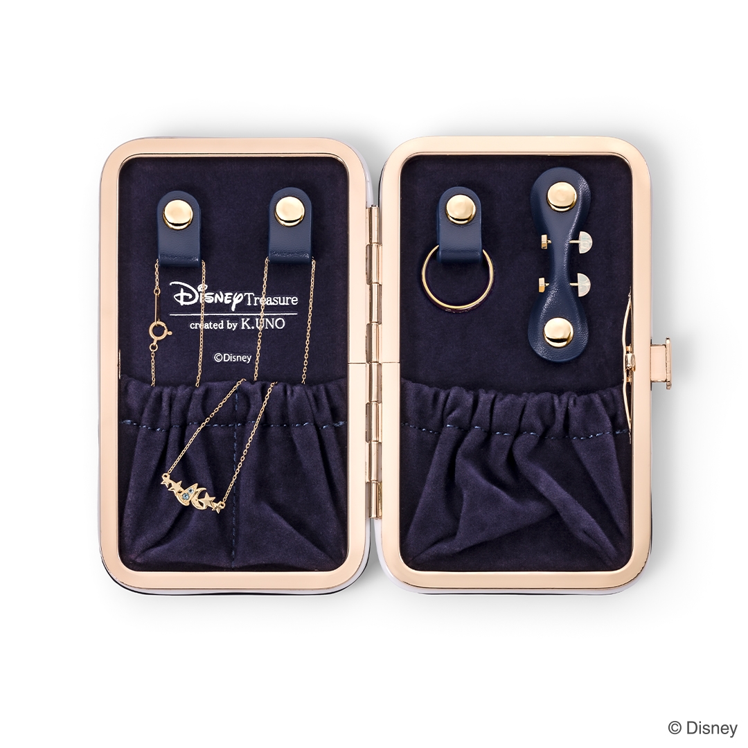 パール感のあるダークネイビーにシルバーの刺繍を施した、クールな印象のトラベルジュエリーケース。魔法使いの弟子に扮したミッキーマウスが夜空の星たちを指揮するシーンを描いた、ケイウノオリジナルデザインです。ケースの中身はスエード調のやわらかな布地を使用。高級感のあるダークネイビーにジュエリーがよく映えます。ネックレス・リング・ピアスなどが収納できます。手のひらにおさまるミニサイズ。年代を問わず使いやすい落ち着いた色味です。専用ケース入りなので贈り物にも。